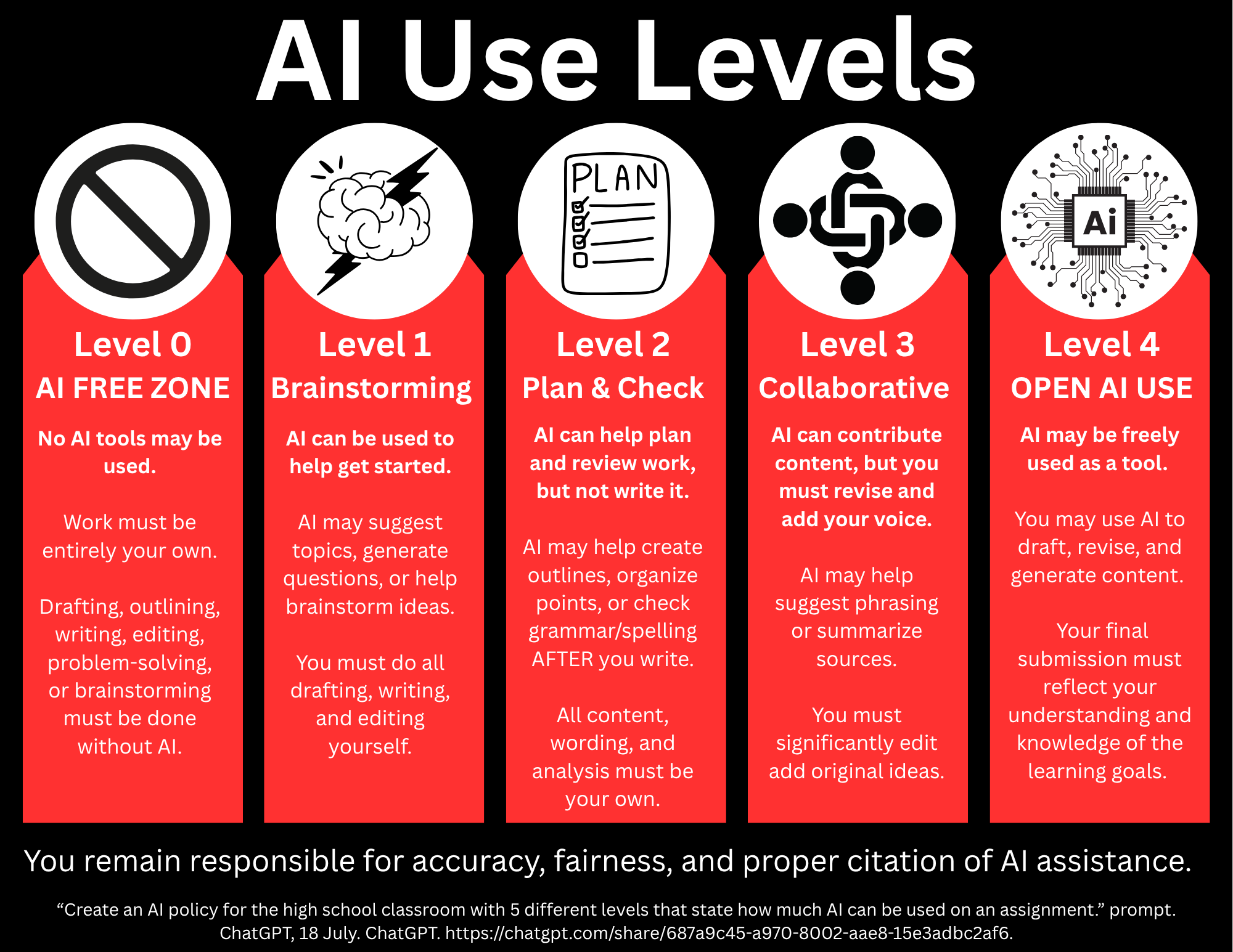 “I am so excited to incorporate AI in my classroom and teach students the proper way to use it, how to stay safe, and how it can be an effective tool when running their businesses,” Ashley shared. She's already implemented these insights at DeKalb through an innovative AI Levels Chart that provides clear guidelines: “For every assignment or project we do, an AI level is assigned so students know exactly how they can or cannot incorporate AI into their work.”